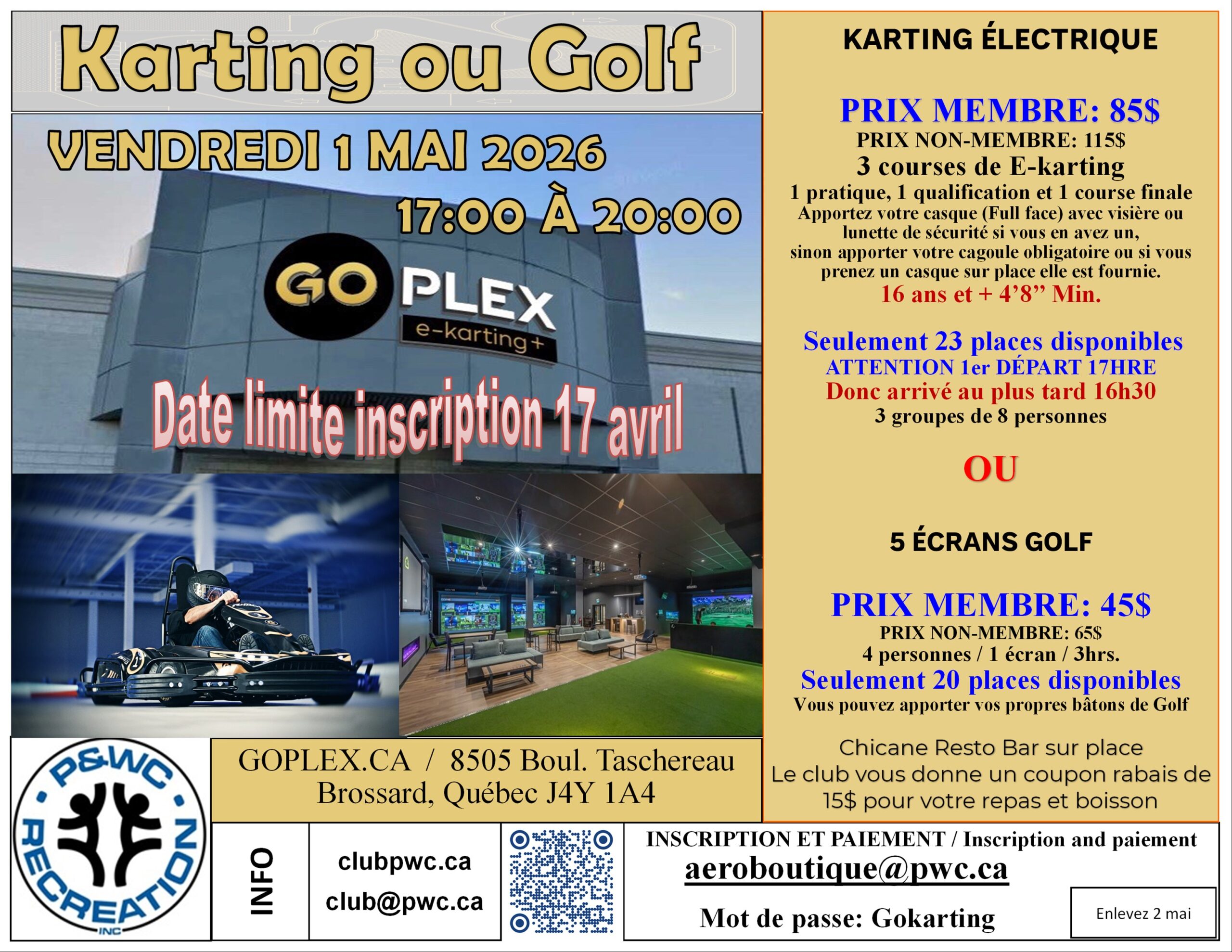 L’activité de Karting ou simulateur de golf est de retour, soit le 1 mai