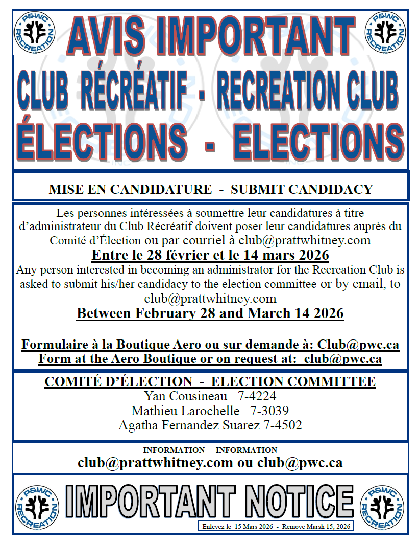 Remplir le bulletin de mise en candidature, et le faire parvenir au comité d’élection par courriel, entre le 28 février et le 14 mars 2026 (en fin de journée). Veuillez aussi mettre en copie le Club Récréatif (club@pwc.ca ). Vous pouvez aussi remettre votre bulletin de candidature à la boutique Aero qui le fera parvenir au comité d’élection.