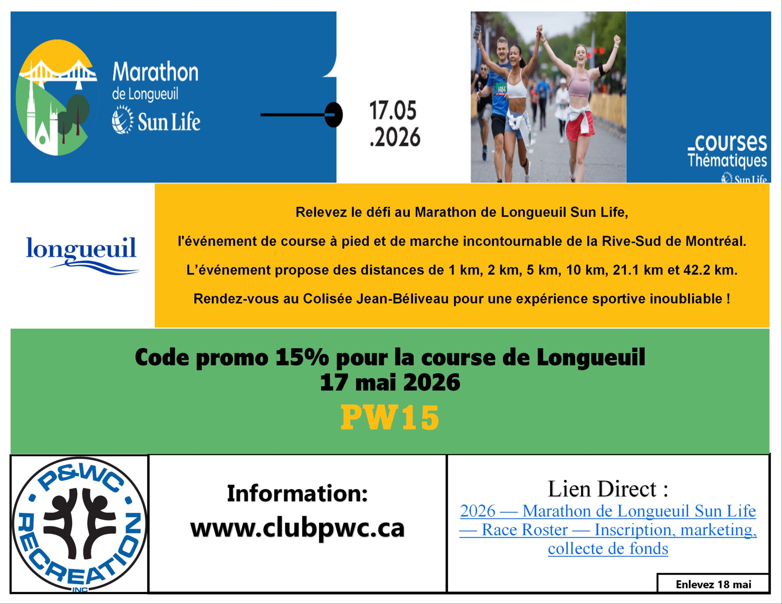 Rabais Activités 31 vues 11 décembre 2025 Marathon de Longueuil Grâce au Club Récréatif, vous obtenez un rabais de 15% sur l’inscription à n’importe lequel catégorie de course pour le Marathon de Longueuil qui aura lieu le 17 mai 2026