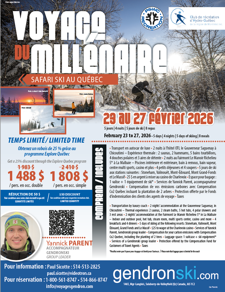 Nous allons accorder un rabais de 50$ aux membres, remboursable par le club sur présentation de l’achat du forfait ski safari au Québec du 23 au 27 Février 2026